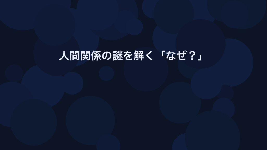 人間関係人間関係の謎を解く「なぜ?」 コメントする / 人間関係 / discoverism_aione 人間関係の複雑さは、文化や社会構造、歴史的背景、テクノロジーの影響など多くの要因によって形成されている。この問題を探ることで、私たちの日常生活や未来の人間関係に新たな理解をもたらすことができる。